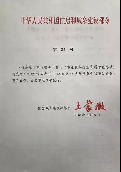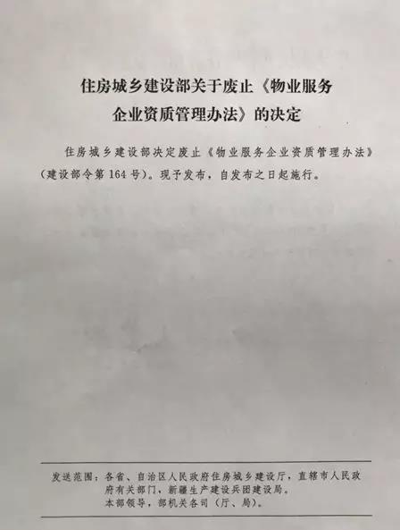 住建部正式發(fā)文取消《物業(yè)服務(wù)企業(yè)資質(zhì)管理辦法》
