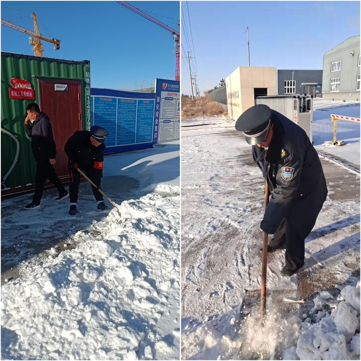 “相比以往,今年冬季這場雪碰上了疫情卷土重來,在雙重突發(fā)狀況之下,確保安全生產(chǎn)的任務艱巨,但我們有信心一定能扛過去!”公司總經(jīng)理郝永祥表示。在大雪突襲后,公司迅速啟動應急方案,24小時專人值守,時刻收集并向各項目保安隊通報最新氣象消息,在提醒各地隊員注意保暖與出行安全的同時,組織開展掃雪除冰,圍繞“清除積雪保通暢”開展各項工作,確保客戶單位進出通道的通暢便捷,以及出入人員車輛的安全有序。